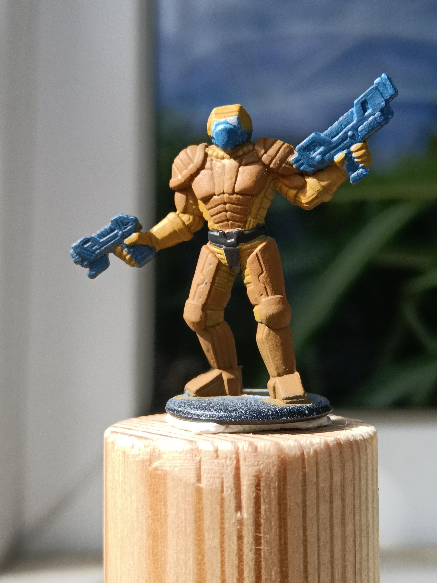 - Dry brush the player color on the left pauldron and cuirass, apply the same color (unthinned) as visor-color